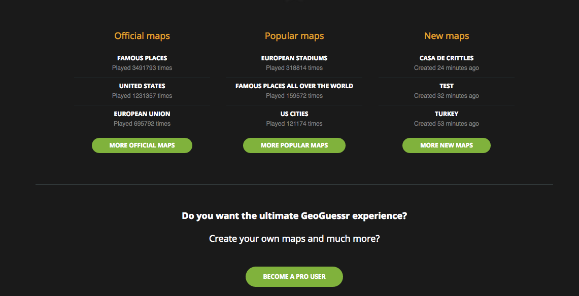 The default world map is the most challenging (and most fun) as it can place you on random roads in the middle of nowhere, leaving you just the topography of the surrounding area and (if you’re lucky) an occasional road sign to inform your guess. There are different maps you can choose from too though, such as country specific ones, famous stadiums or famous landmarks.